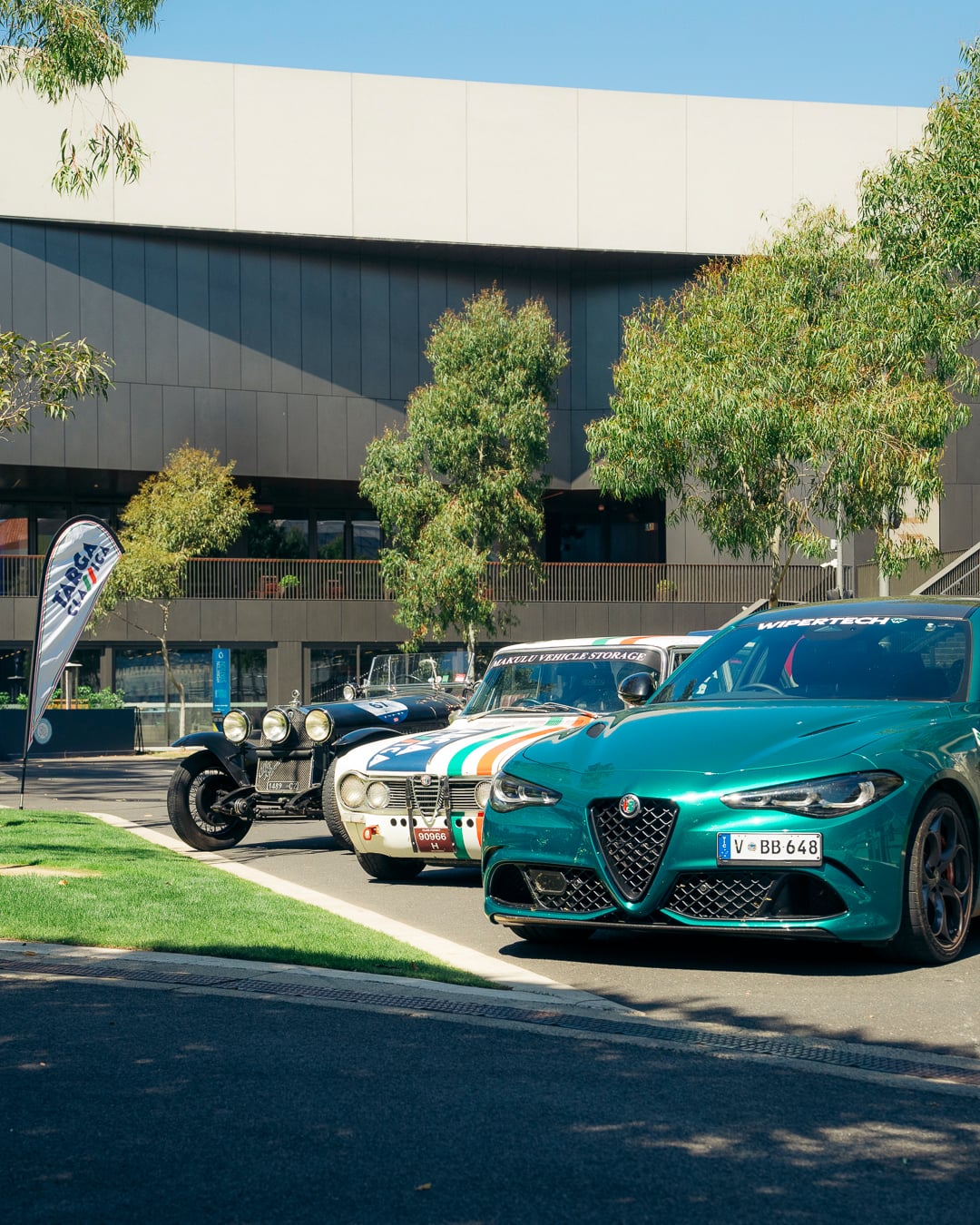 The Grand Finale at Melbourne Park, with the F1 circus assembling nearby, is a fitting end to our Targa Classica. Classic machinery under the lights, Italian heritage on full display.