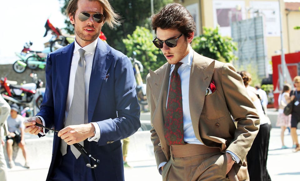 We recommend a silk knitted tie with a square bottom. It offers a quirky point of difference from regular ties and also has a slightly more fun and casual feel. Try Oscar Hunt Tailors or Thom Browne for starters. The chicest combination colour wise is a block coloured suit with a contrasting tie – take the gent above with the olive knit and Neapolitan tailored two-piece as your style reference. It’s the perfect mixture of devil may care nonchalance and sartorial splendour.