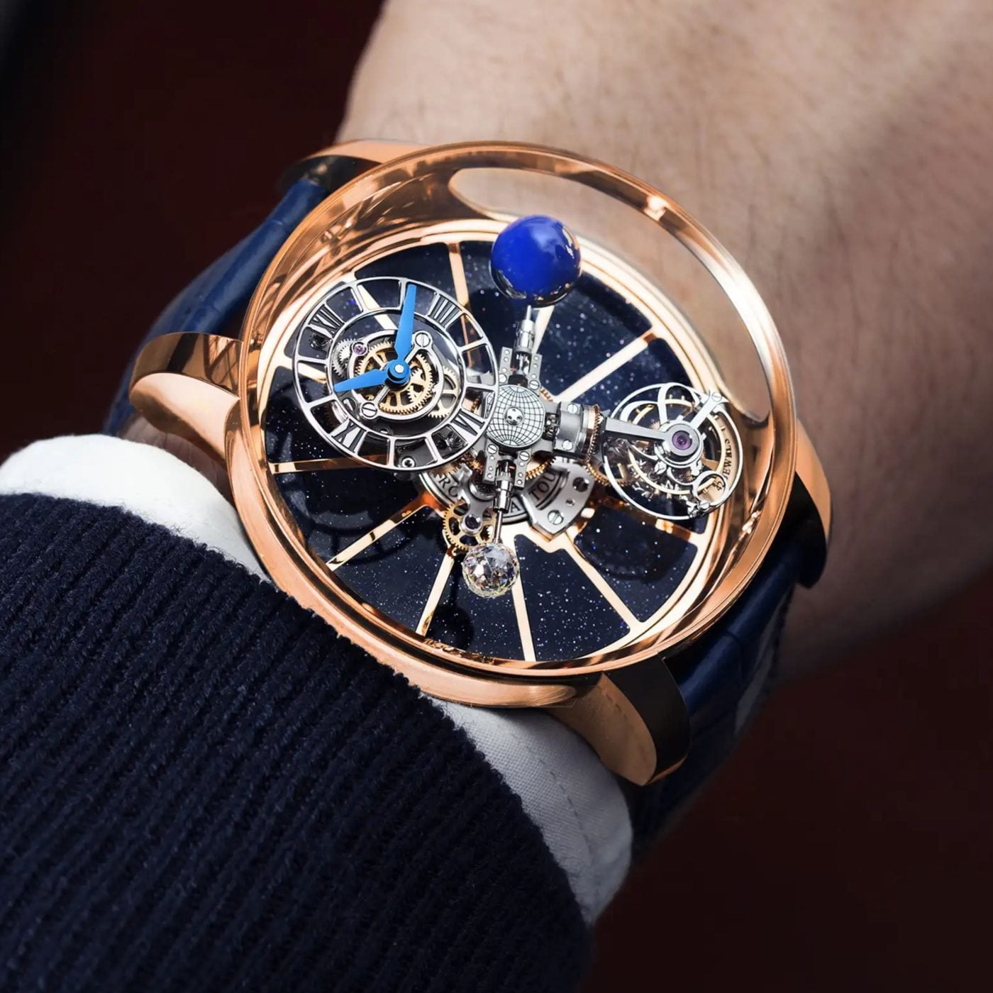 Each Astronomia is built around a central vertical axis where four arms rotate continuously: one carries the triple-axis tourbillon, another the time display, another a miniature Earth, and another a hand-painted magnesium globe or rotating diamond representing the Moon. The entire assembly makes a full rotation every ten minutes, all powered by the wearer’s effort.