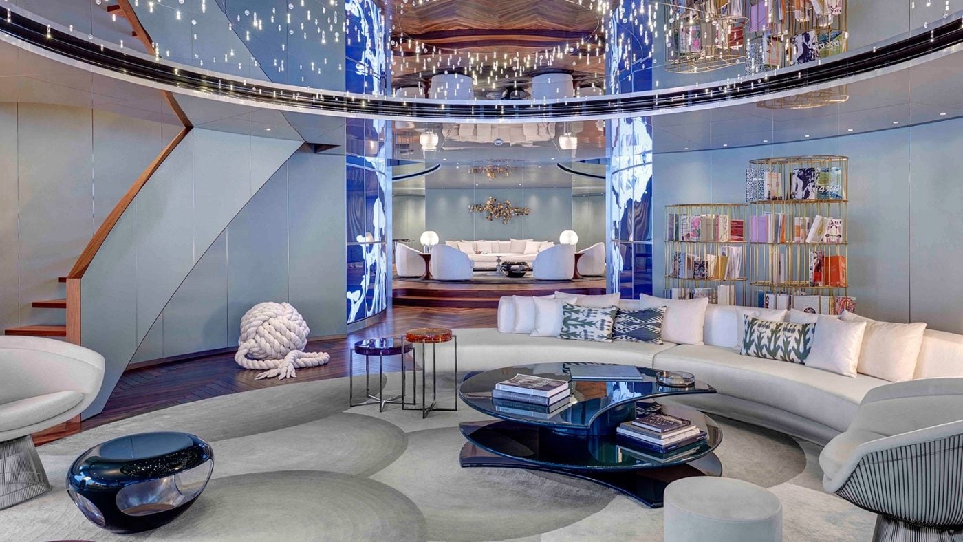 The interiors of Savannah are filled with luxury including six suites that sleep twelve, along with an owner’s cabin with its own private deck, dining room, saloon, office, marble bathroom, and terrace complete with a helipad. There’s also a gym, beauty salon, spa, and a nine-meter mosaic pool surrounded by sun loungers, all styled by the acclaimed CG Design studio in Paris.