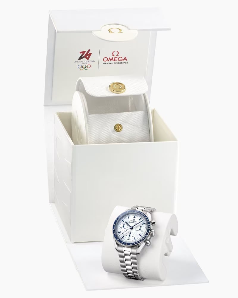 Each watch arrives in a crisp white presentation box featuring the Games’ red-and-black competition emblem, a nod to OMEGA’s long-standing commitment to sport and design.