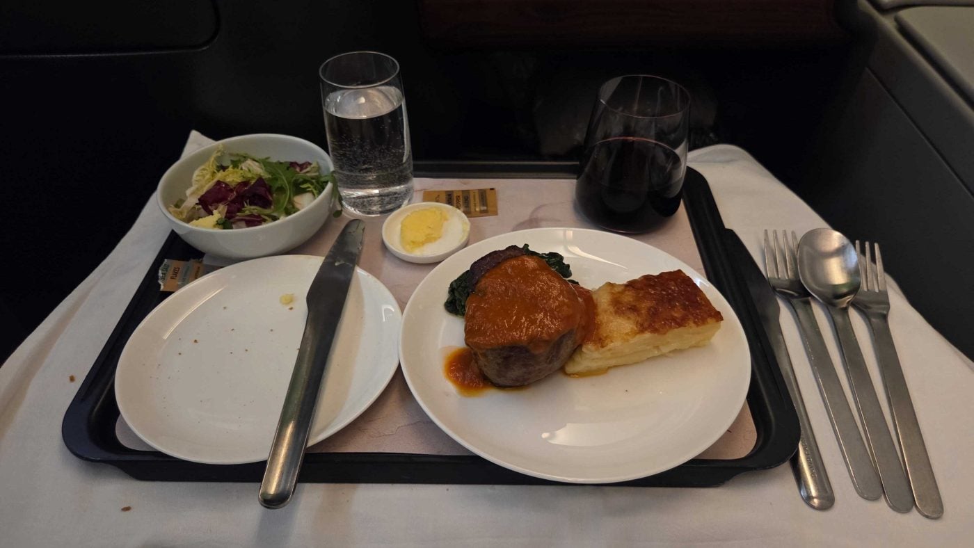 On this LHR to SIN leg, service kicked off with warm salted nuts and a drink, followed by a choice of four mains. The standouts were a beef fillet with Café de Paris butter and soft polenta, and a surprisingly good Kakuni-style pork dish with rice, choy sum, and bonito flakes.