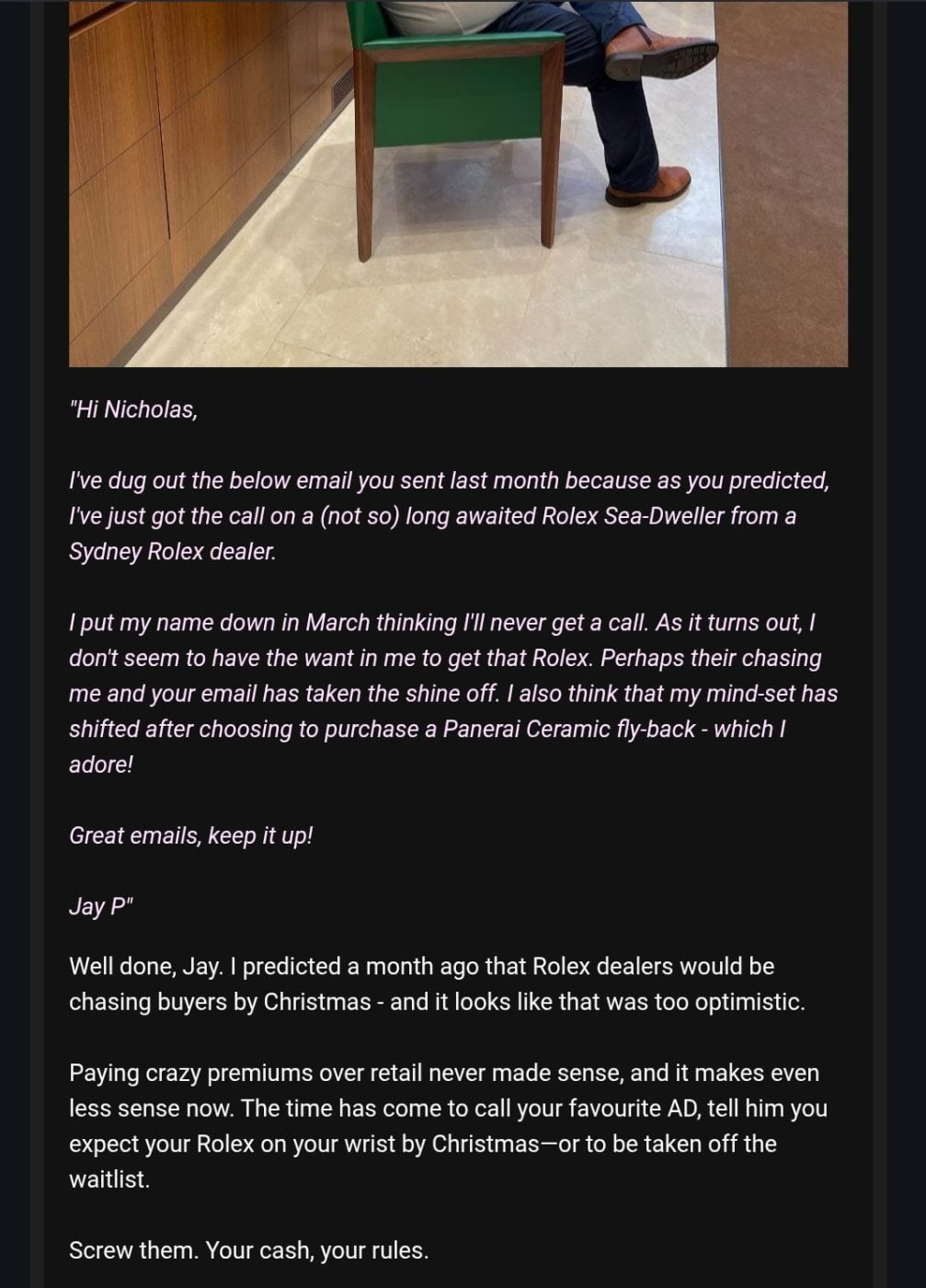 Suddenly the buyer who would pay a forty to eighty percent premium for the privilege of owning a diver on Tuesday was happy to wait until Friday.