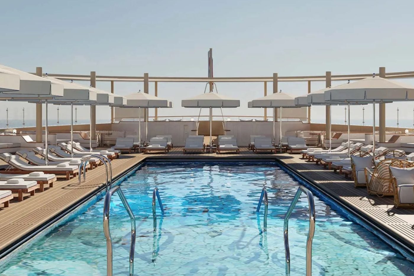 The standout attraction is The Funnel Suite, a four-level penthouse perched on the top decks where a smokestack would traditionally sit, offering 9,500 square feet of private space for just six guests, including a pool, spa treatment room, and wraparound terrace.